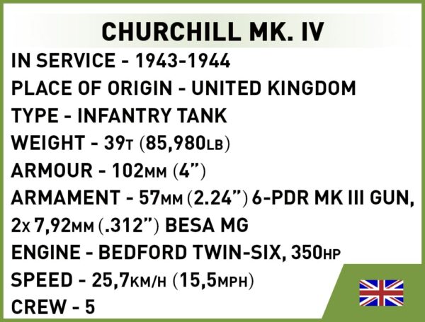 The Tank, Mk IV (A22) Churchill was a British infantry tank used in the Second World War, best known for its heavy armor, large longitudinal chassis with all-around tracks with multiple bogies, its ability to climb steep slopes, and its use as the basis of many specialist vehicles. It was one of the heaviest Allied tanks of the war.