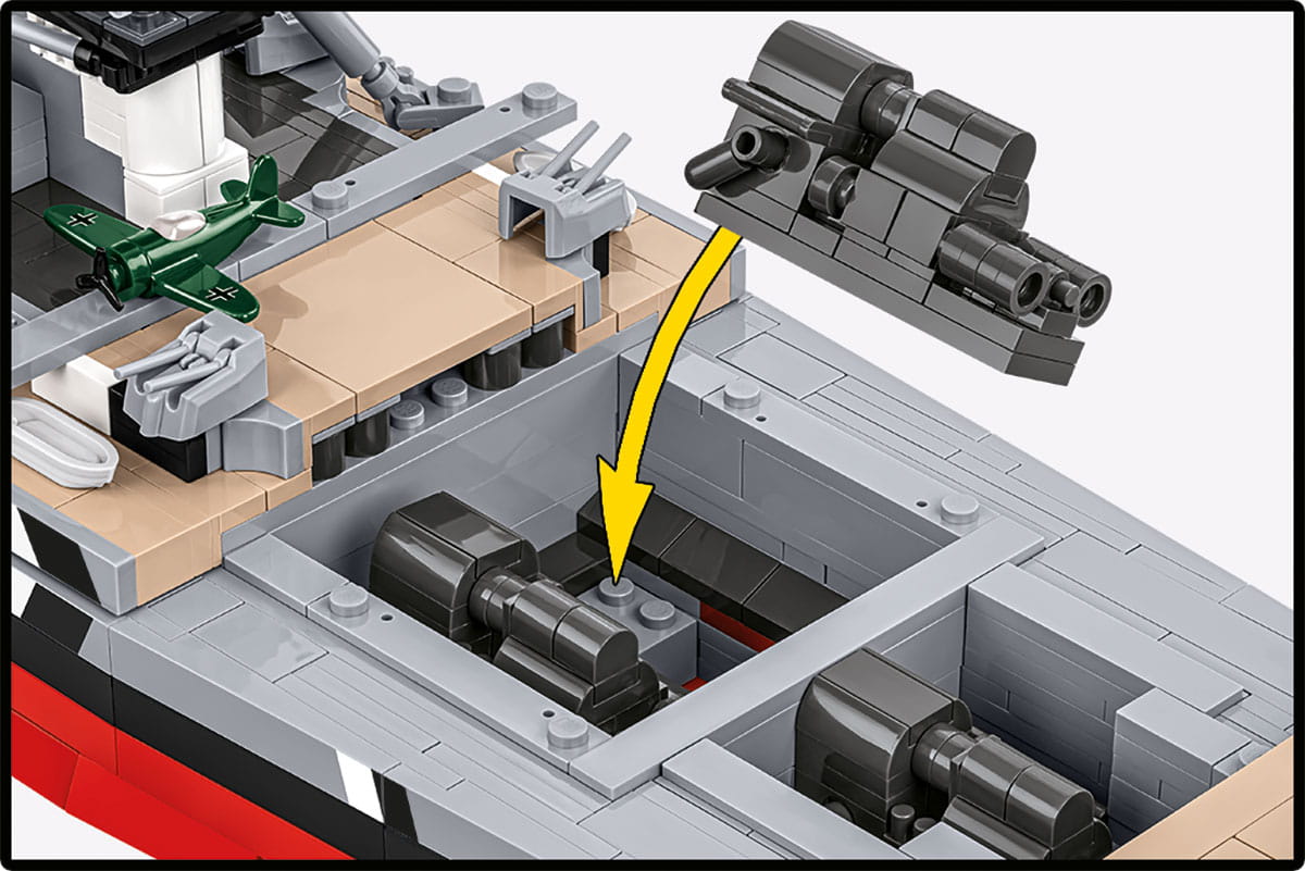 Recreate history with the COBI Battleship Bismarck 4860. This 1:300 scale WWII set features 3,204 pieces, removable decks for engine access, and articulating guns.