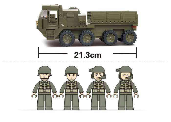 Command the supply line with the Sluban Heavy Transporter. This 306-piece building kit features a 1:35 scale HEMTT-style truck, a removable anti-aircraft cannon, and 4 soldier figures. Perfect for display or robust play.