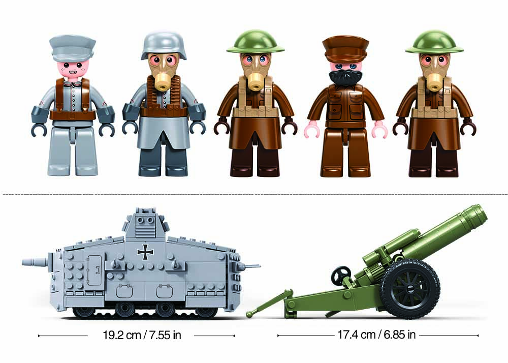 The set includes five highly detailed brick figure soldiers who carry authentic-looking weapons and accessories, ready to man the tank or hold their defensive line. Builders can deploy the towable artillery cannon and set up defensive barricades with brick horses to recreate a dynamic front-line scene. Clearly, this Sluban set delivers historical depth and engaging playability for collectors and young enthusiasts alike.